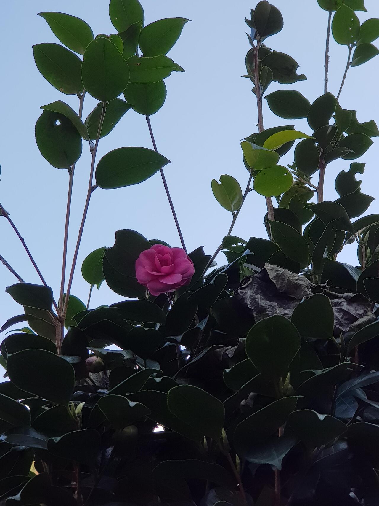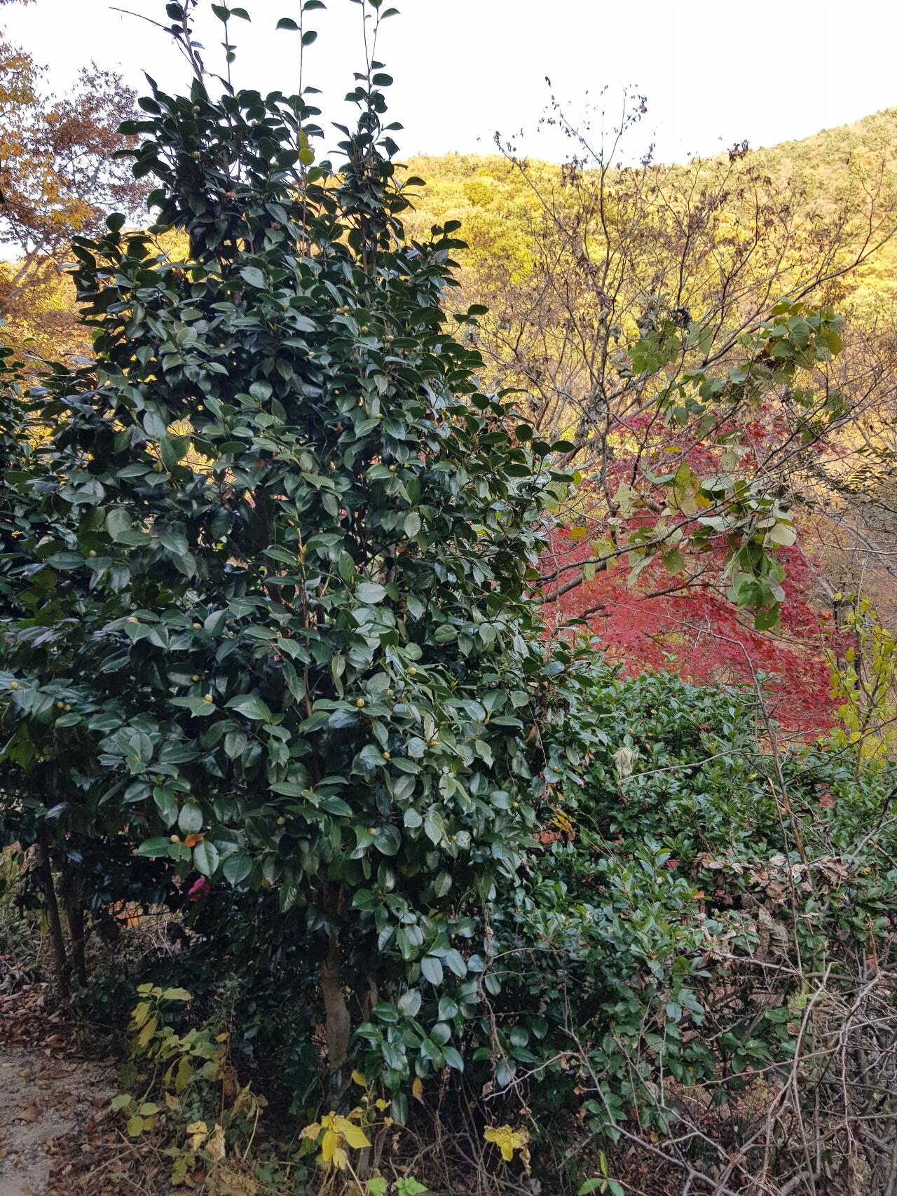 우측에는 어린 동백나무 두 그루가 있는데 꽃망울을 맺고있다