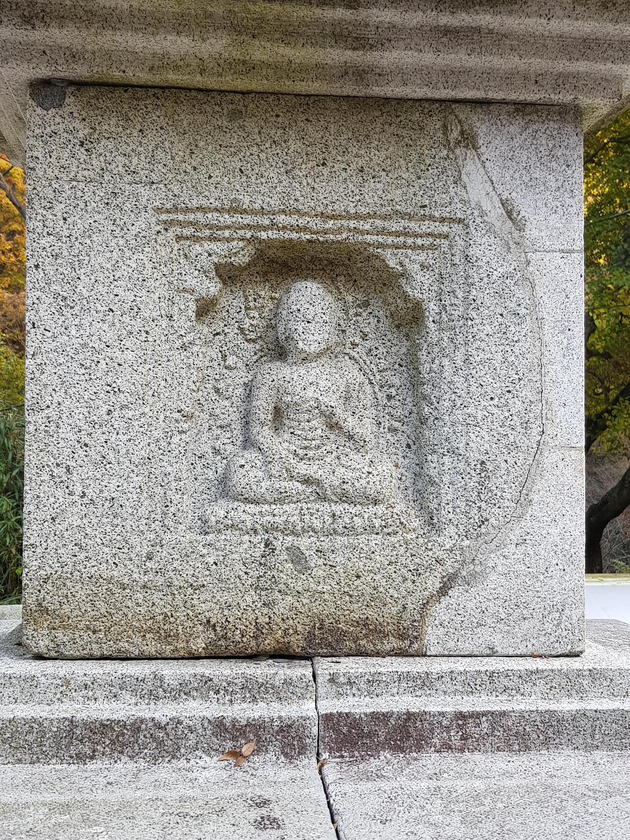 탑신의 1층 몸돌은 네 면마다 문 모양의 무늬를 새기고 그 안을 파내어 불상을 도드라지게 새겨 두었다.
