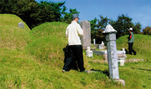 무덤 아래에 수맥이 흐르는지 확인하는 사람들.
