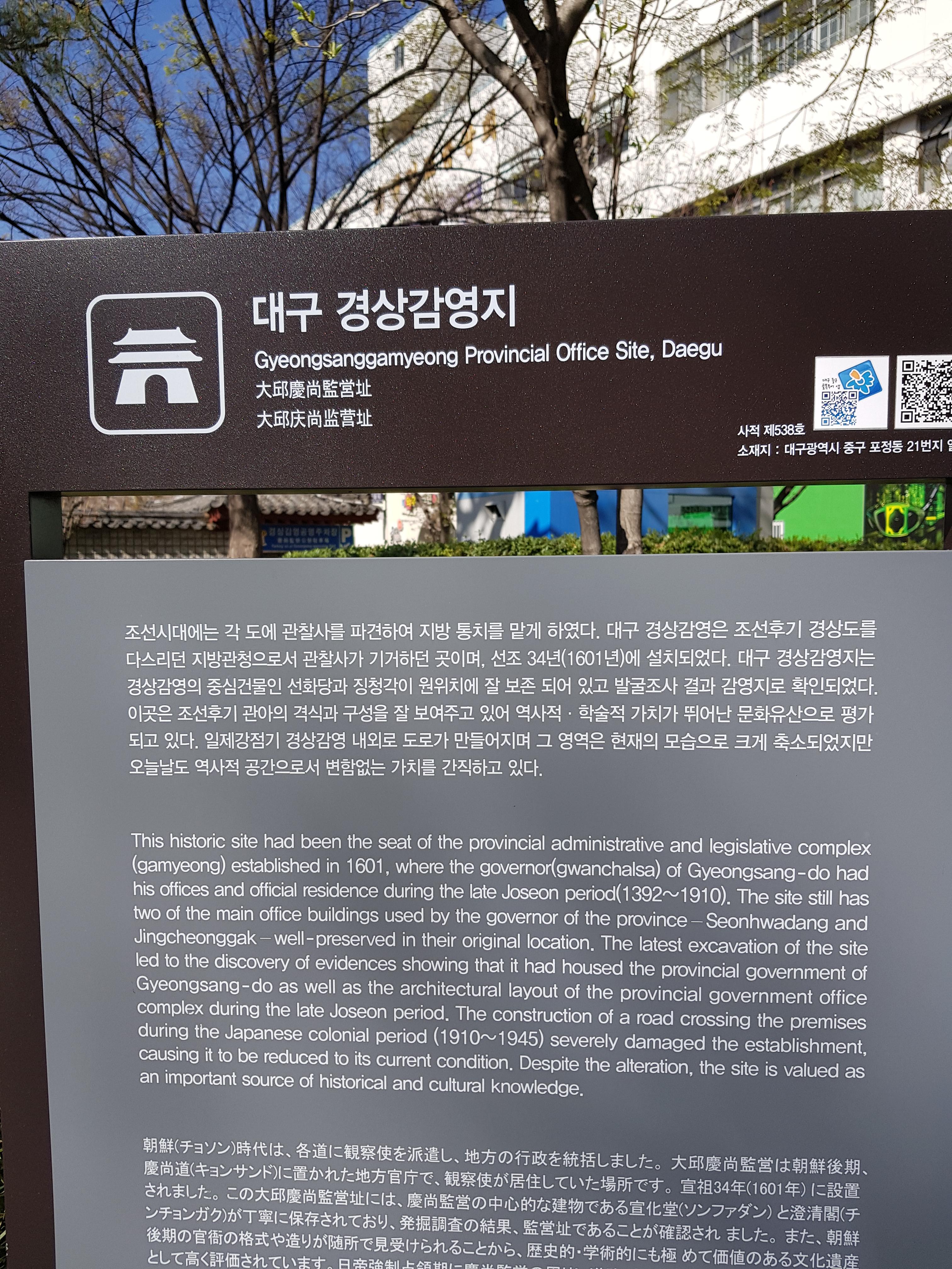 경상감영공원은 조선 선조 34년(1601) 경상감영이 있던 장소로서 대구도심 중앙에 위치한다.