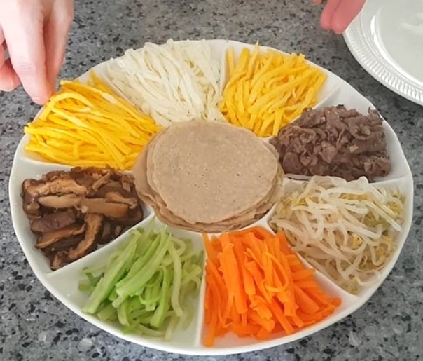 둘레의 여덜 칸에 고기와 버섯, 채소 등 여덜 가지 음식을 색색으로 담고, 가운데 둥근 칸에는 얇게 부친 밀전병을 담아 둘레의 음식을 골고루 전병에 싸서 먹습니다.
