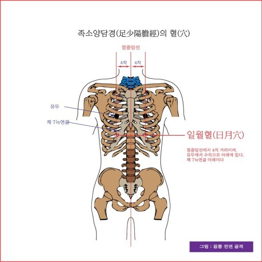 예를들어서 담(膽)이 허(虛)하여 기(氣)가 위로 올라와 입맛이 쓸때는 담경의 모혈인 일월혈(日月穴)을 자극하면 치료할 수 있어요.