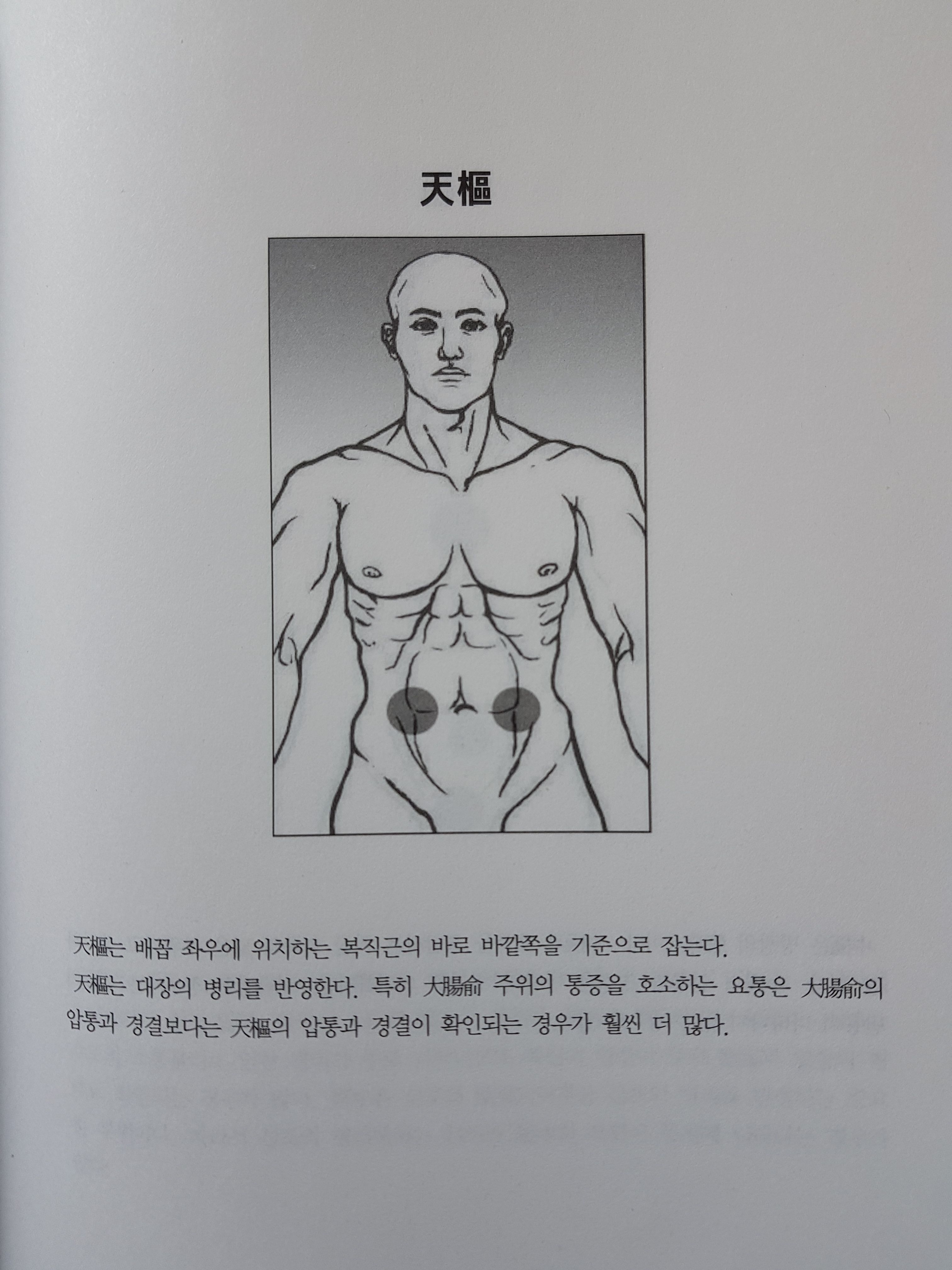 천추는 배꼽 좌우에 위치하는 복직근의 바로 바깥쪽을 기준으로 잡는다