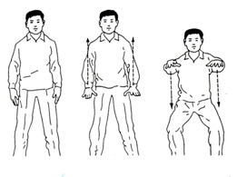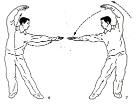 숨을 들여쉬면서 양팔을 올리고 좌우로 엽구리 운동하듯이 옆꾸부리면서 날숨한다.