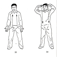 두 손으로 좌우로 비껴 뒤로 올리고(들숨) 내린다(날숨).